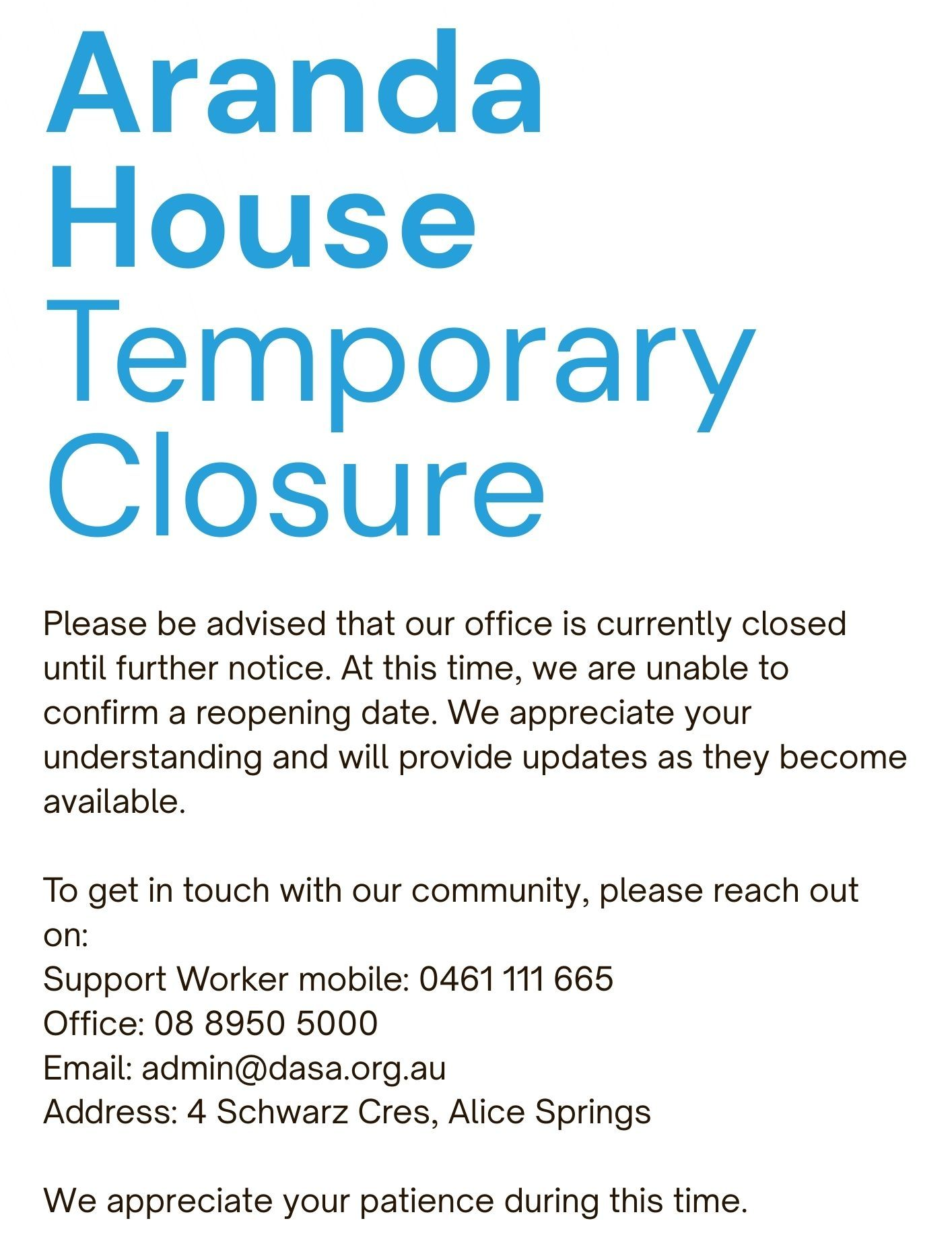 For further information, please do not hesitate to contact Joel Pillay, Executive Assistant Strategy on joel.pillay@dasa.org.au or 08 8950 5000.